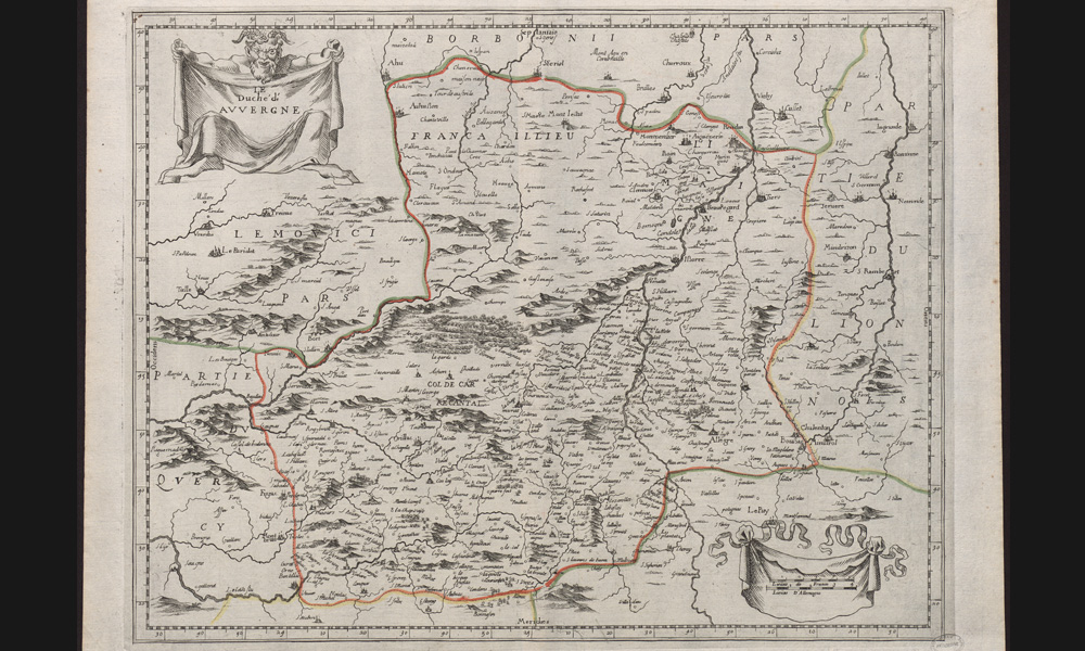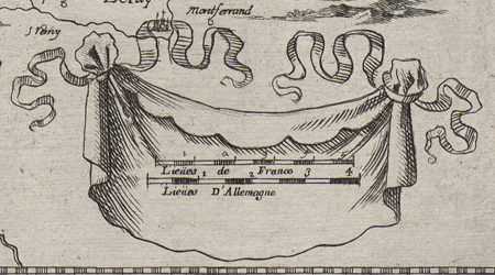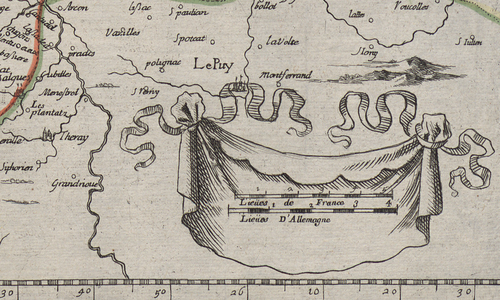 Titre : Le duché d'Avvergne Cote : CA DEL 1748 Ce cartouche, gravé en bas à droite, représente une étoffe avec rubans et mentionne des échelles exprimées en "Lieües de France" et en "Lieües d'Allemagne".