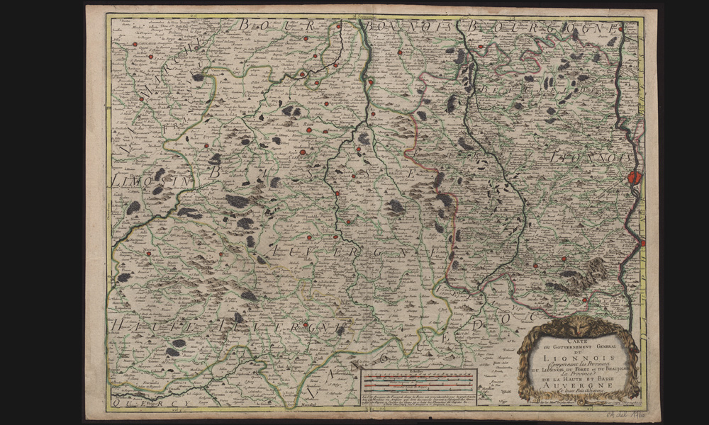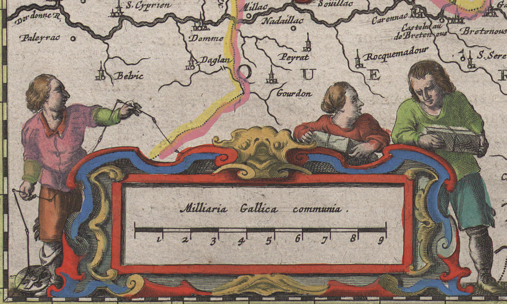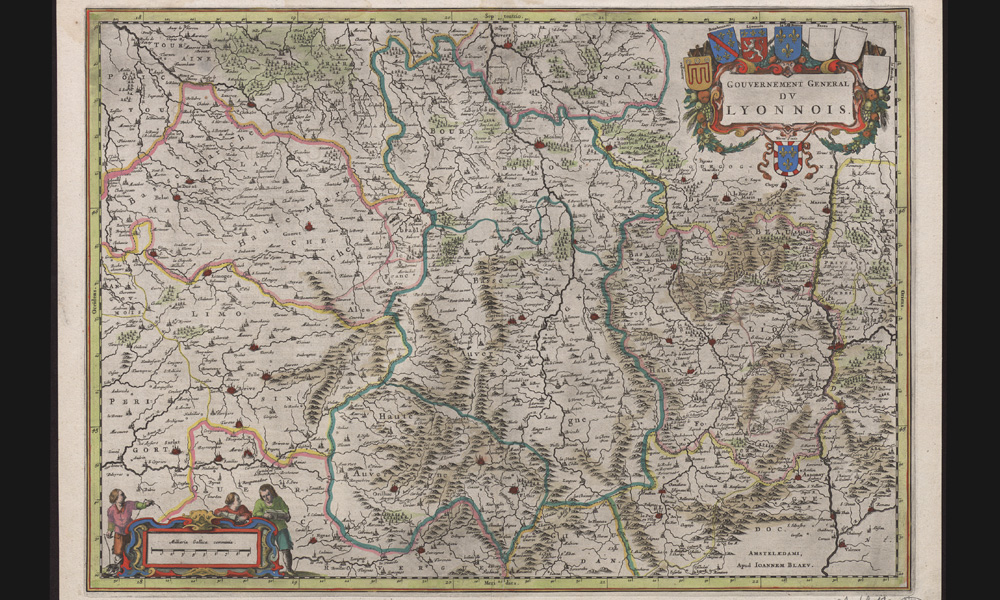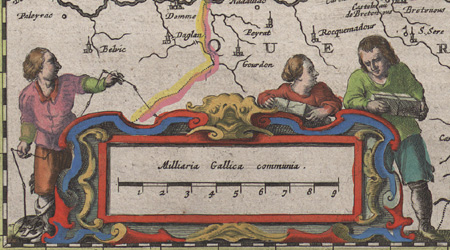 Titre : Gouvernement général du Lyonnois Cote : CA DEL 1759 Cartouche contenant au centre l'échelle "Milliari Gallica communia" orné de trois personnages : deux portent des rames de papier, le 3e manipule une chaîne d'arpenteur.