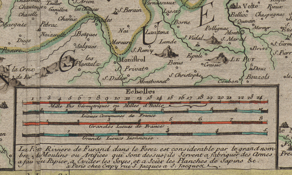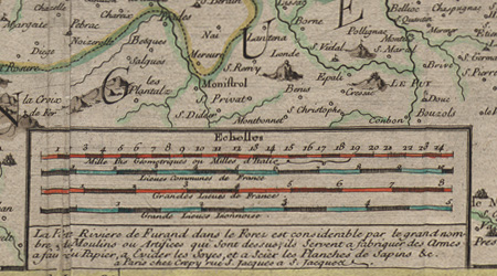 Avant l'adoption exclusive du mètre au début du XIXe siècle, les unités de longueur sont multiples et connaissent des variations qui rendent la lecture des échelles complexe : lieues, arpents, perches, toises, pieds... coexistent mais ne désignent pas toujours la même longueur. Par exemple, la lieue, qui est la distance parcourue par un homme à pieds en une heure, varie selon les époques et les contrées.